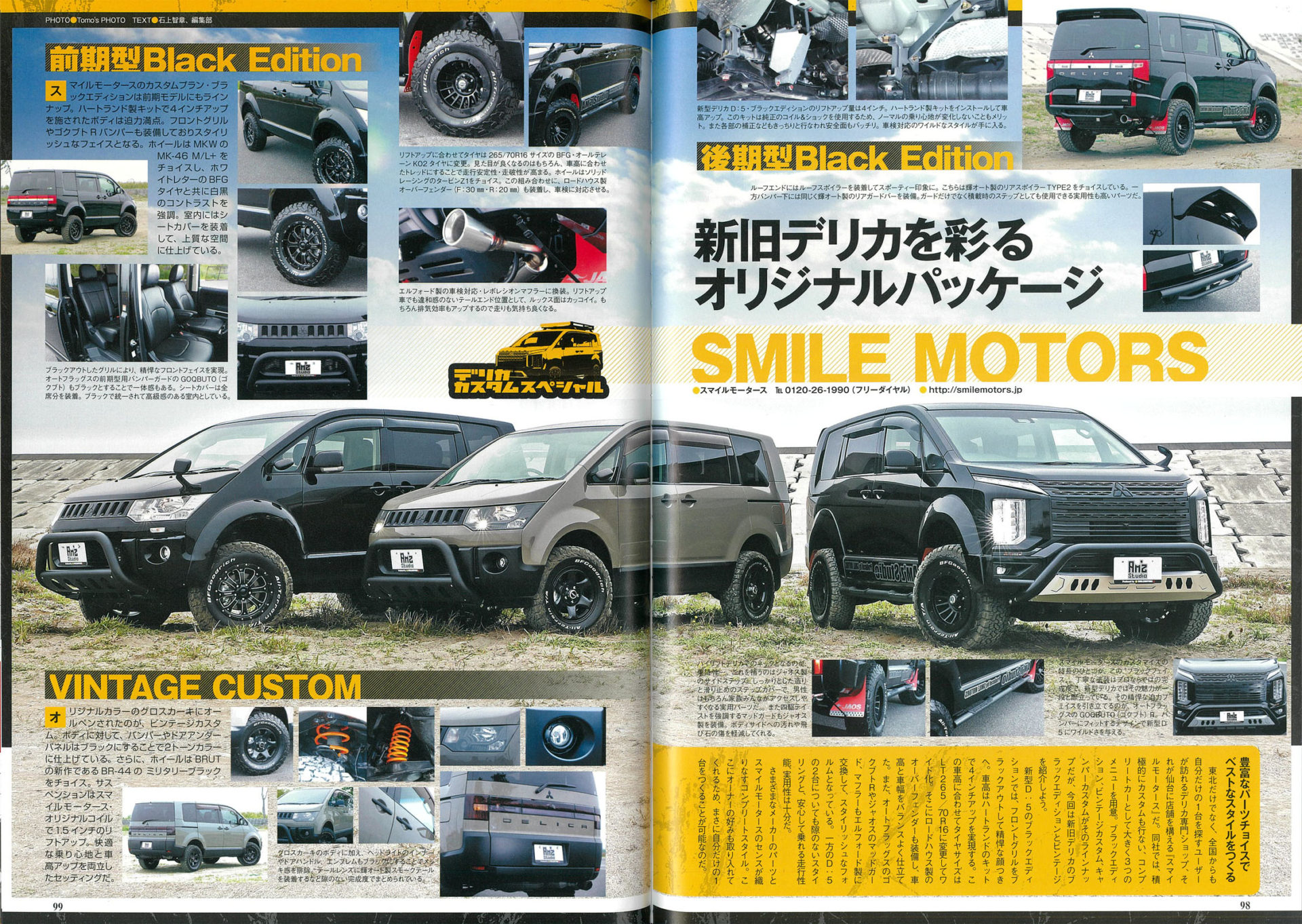 SMILE MOTORS(スマイルモータース)様の紹介ページにて、MKW▲ホイール「MK-46 M/L+」とBRUTホイールの最新作「BR-44」ミリタリーブラックを装着した前期型DELICA D:5が見開きで掲載・紹介されております!(P98-99)