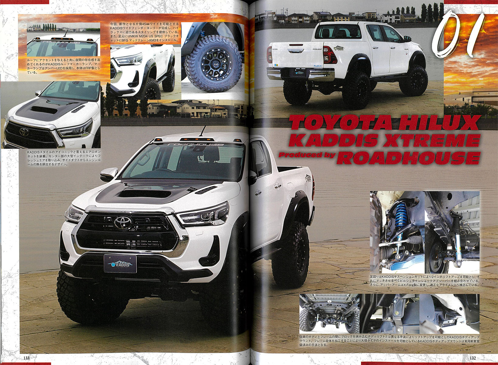 MKW▲のOFF -ROADシリーズ「M204」US SpecのBlack Cat(ブラックキャット)カラーを装着したロードハウス様デモカーのハイラックスが4ページにわたり掲載・紹介されております! (P130 – 133)