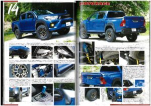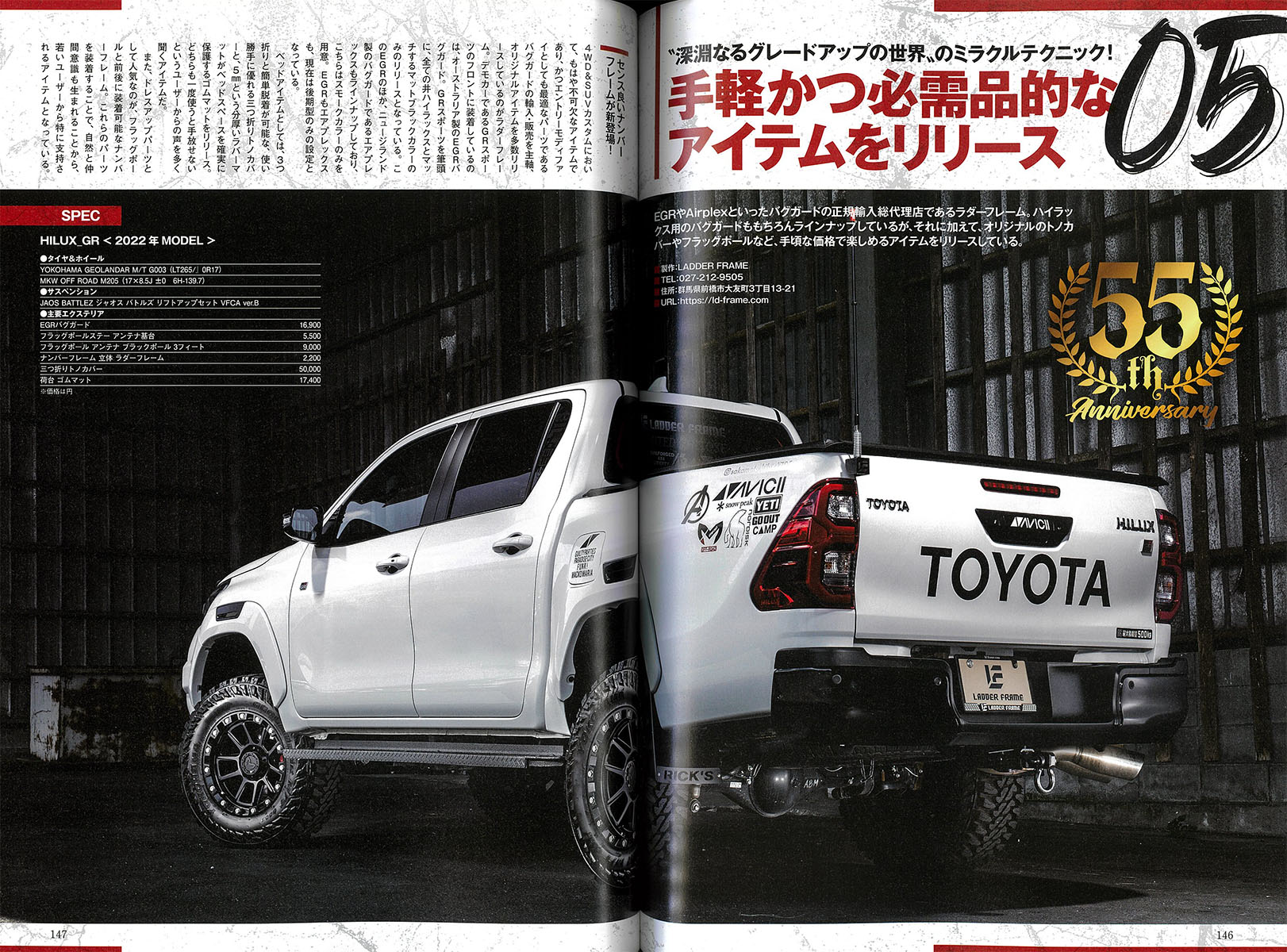 MKW▲OFF-ROADシリーズNew MODEL「M205」Coyote Bronze(コヨーテブロンズ)とBlack Cat(ブラックキャット)US SPECを装着したLADDER FRAME(ラダーフレーム)様デモカーのハイラックスが4ページにわたり掲載・紹介されております! (P146 – 149)