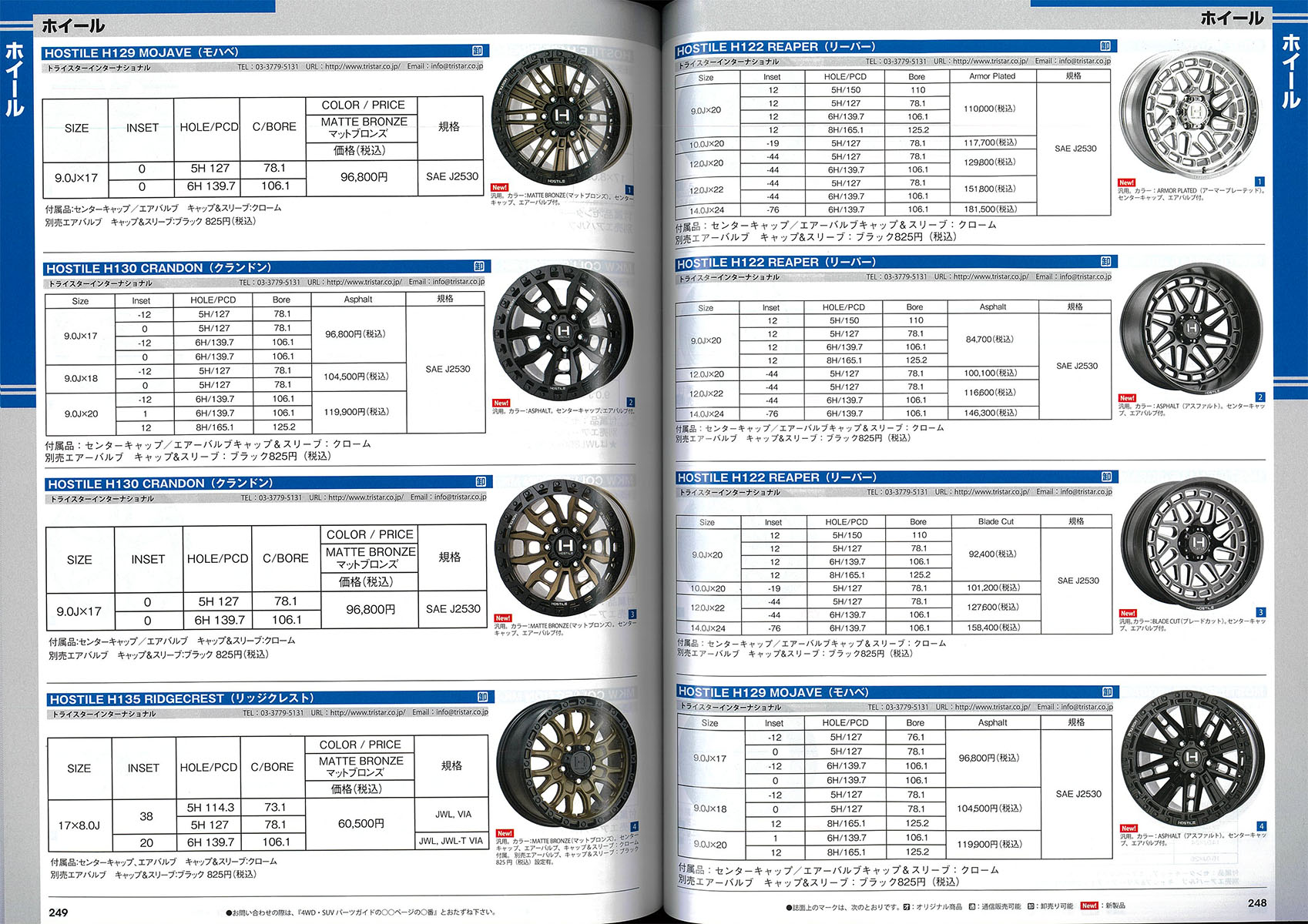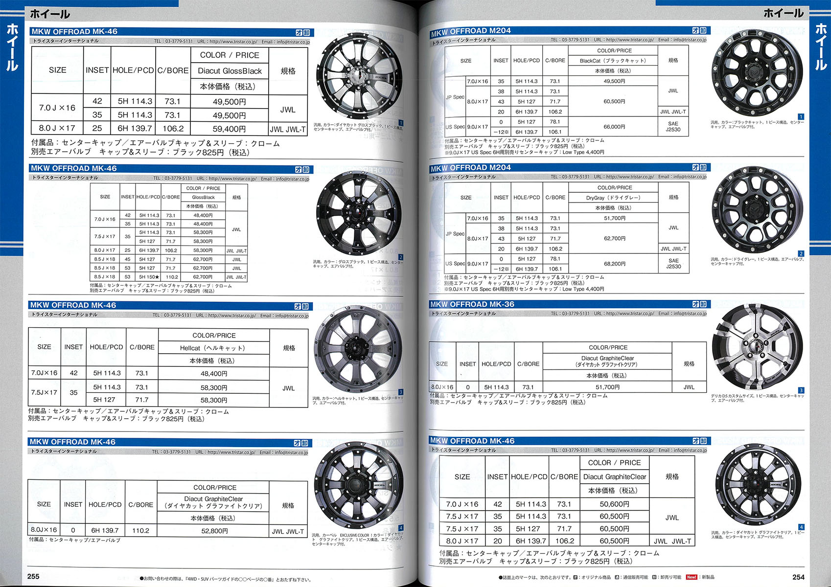 ホイールカタログページ内でMKW▲ホイール及びHOSTILE(ホスタイル)ホイール(日本販売モデル)の全種類及びカラーが全て掲載・紹介されております! (P247 – 257)