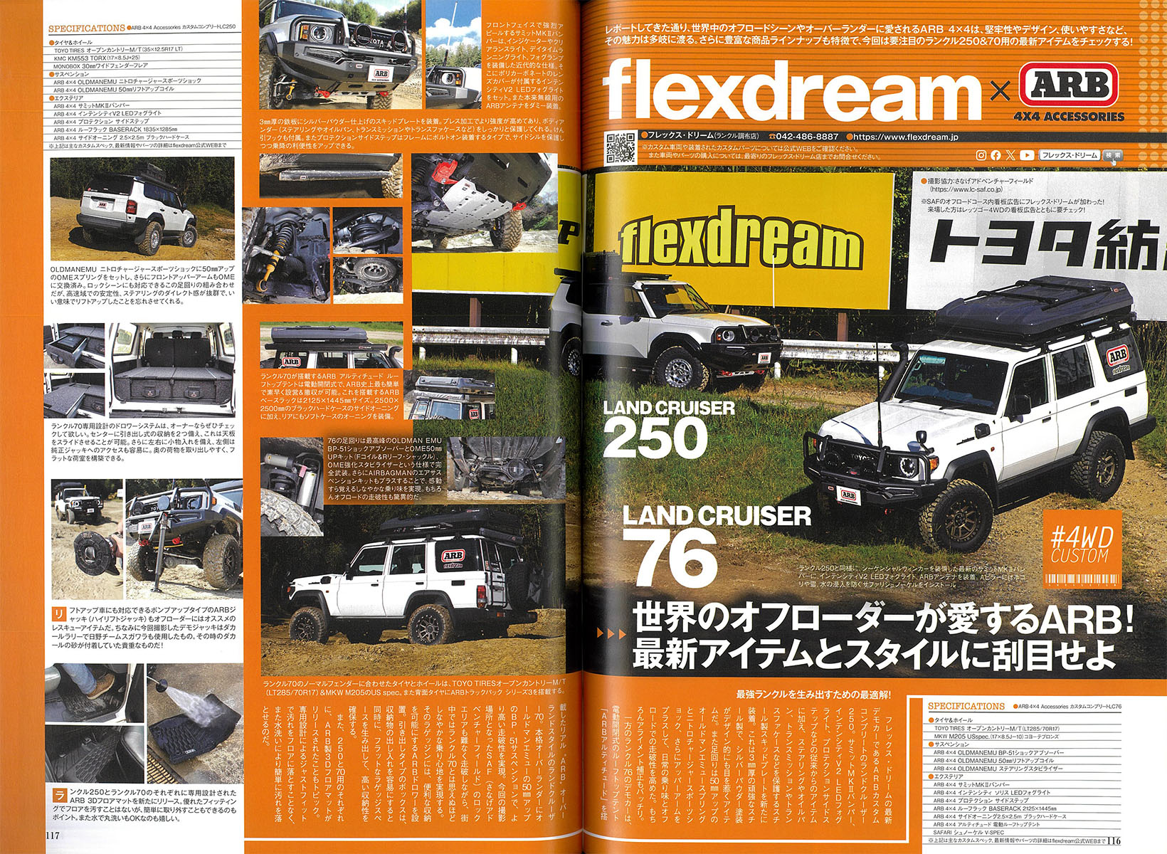 MKW OFF-ROAD「M205」US Spec 17インチのCoyote Bronze(コヨーテブロンズ)を装着したフレックスドリーム x ARB様デモカーのランドクルーザー70が掲載・紹介されております。(P116 – 117)