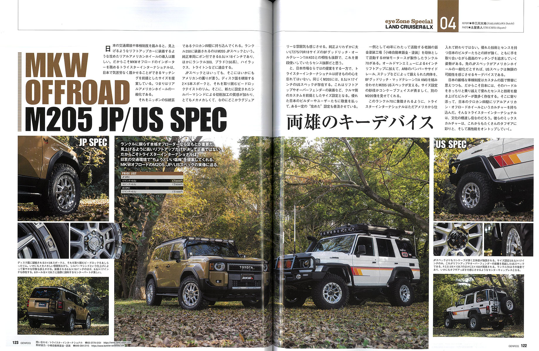 MKW OFF-ROAD「M205」US SpecのNewカラー:Silver Machined(シルバーマシンド)を装着した小峰自動車板金・塗装様デモカーのランドクルーザー70とJP Spec 18インチのシルバーマシンドを装着したランドクルーザー250が掲載・紹介されております。(P122 – 123)