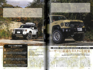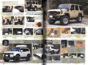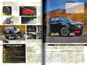 GOOSFAM(SANO AUTO)様デモカーのランクル250にMONOBOX フェンダーフレアを付けて「MK-46」を装着した車両と「M205」JP Specのコヨーテブロンズを装着した車両、そしてランクル70で「M205」US Specを装着したランクル70等が4ページにわたり掲載・紹介されております。(P274 – 277)