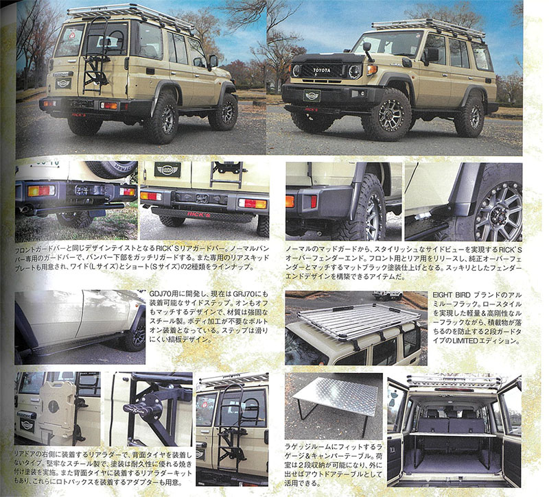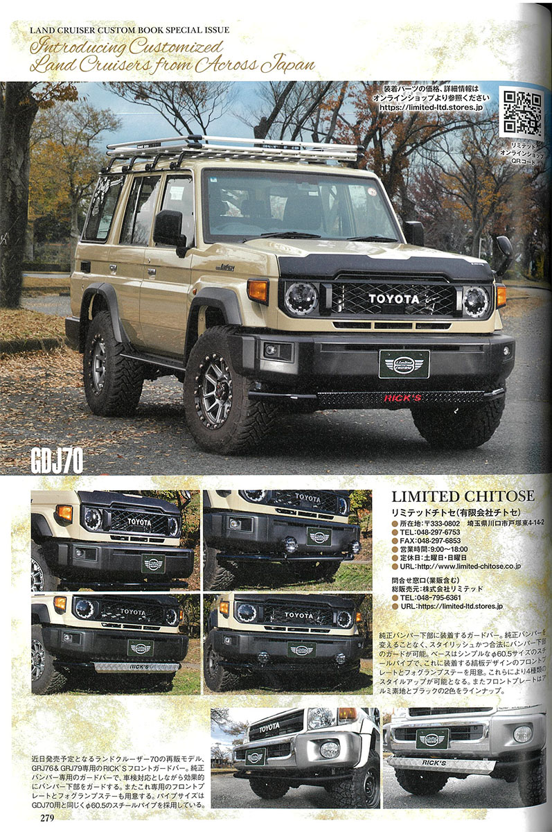 MKW OFF-ROAD「M205」SANO AUTO様専売カラーのDry Gray(ドライグレー)を装着したリミテッド・チトセ様デモカーのLAND CRUISER 70が掲載・紹介されております。(P279 – 280)