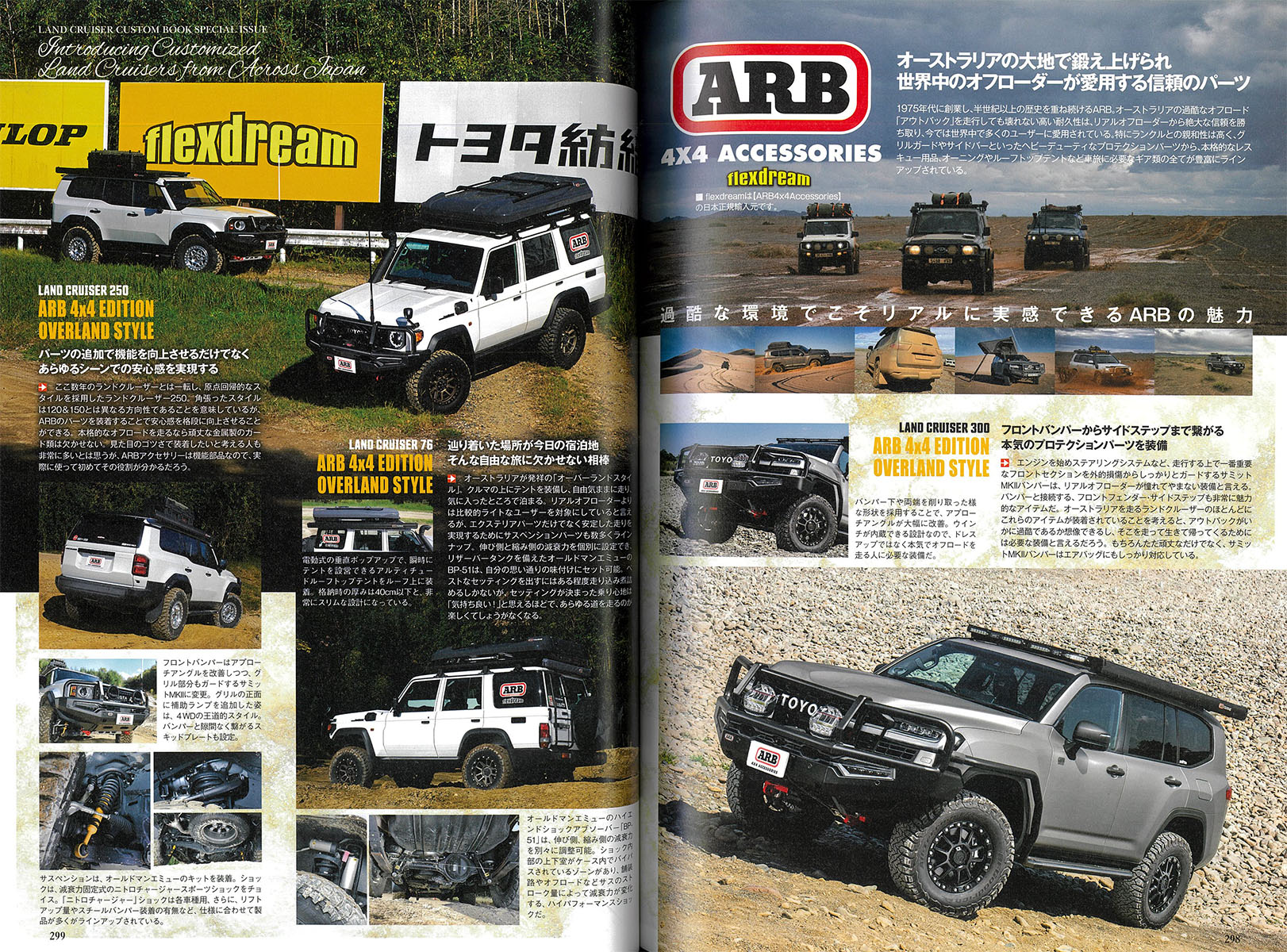 MKWオフロードシリーズ「M205」JP Specを装着したARBデモカーのランクル300や「M205 」US Specを装着した同じくARBデモカーのランクル70が掲載・紹介されております。(P298 – 299)